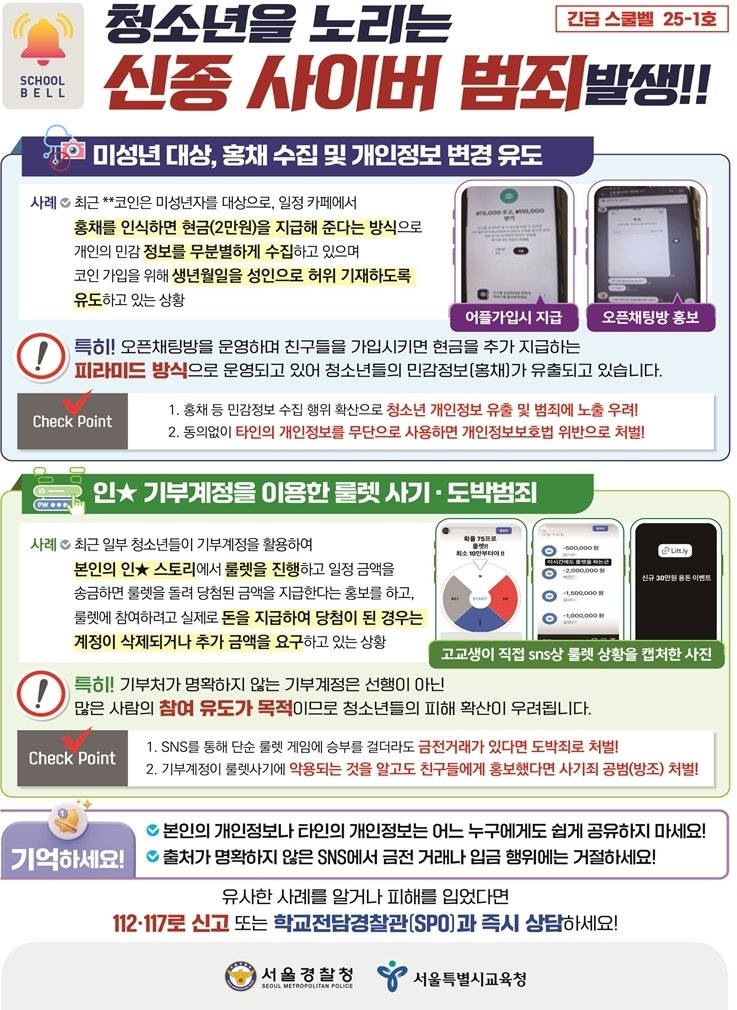 “카페 와서 홍채 인식하면 현금 2만원 드려요!”최근 서울에서 청소년을 현금으로 유인해 홍채 정보 등 민감한 생체정보를 수집하는 신종 범죄가 발생해, 경찰이 전례 없이 ‘긴급 스쿨벨’까지 발령하는 초강수를 뒀습니다.단순한 사기처럼 보이지만, 이 범죄의 본질은 ‘미성년자의 생체정보를 수집해 불법 유통 또는 악용하는 사이버 범죄’입니다.가장 우려되는 건, 피해자가 범죄에 악용되는 도구가 되어 친구를 끌어오게 만든다는 구조입니다. 🚨 무슨 일이 일어난 거죠? 최근 서울 일대에서 청소년들을 대상으로 한 신종 사이버 범죄가 발생해 서울경찰청이 긴급 경보(스쿨벨)를 발령했습니다.내용을 살펴보면 단순한 사기 수준을 넘어서, 홍채와 같은 생체 정보를 수집해 갈 가능성이 높고, 이는 매우 심각한 개인정보 침해이자 ..